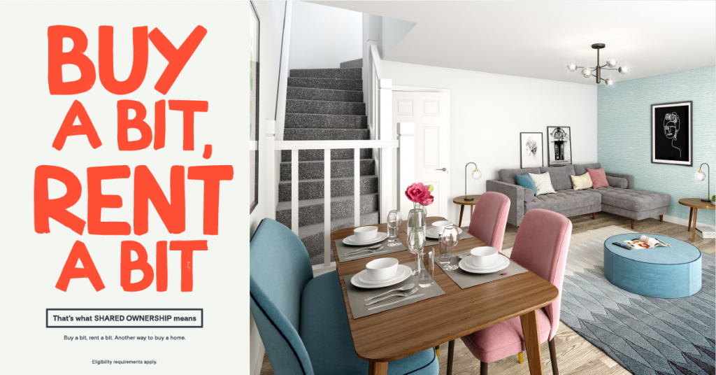 Shared ownership is another way to get on the housing ladder, allowing buyers to purchase a percentage of the value of the home (which means a smaller deposit and mortgage), then pay rent on the rest. Buyers can also buy more shares over time, until they own it 100%.